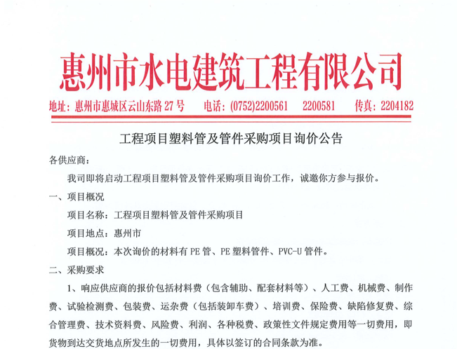 惠州市水电建筑工程有限公司成立于一九六四年四月,隶属惠州市水务集团有限公司,是一家国有综合性施工企业,主营水利水电工程、房屋建筑、市政工程等施工业务。公司拥有水利水电工程施工总承包一级、建筑工程施工总承包一级、市政公用工程施工总承包一级、公路工程施工总承包三级,公路路基、路面及建筑装修装饰专业承包二级,环保工程、机电安装、河湖整治、输变电工程专业承包三级等经营资质……